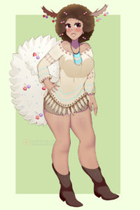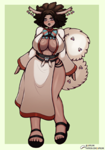 In a secluded village nestled deep within a lush, verdant forest, lived a remarkable woman named Dawne. She was a dark-skinned Faisee, a unique species known for their afro hair, antlers that bore fruit, and bushy squirrel-like tails that also produced fruit, called Fraishunes. Dawne’s existence was a testament to the beauty and wonder of nature, and she was proud of her heritage.