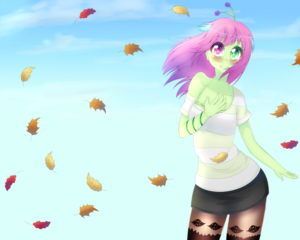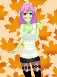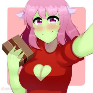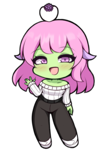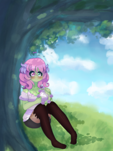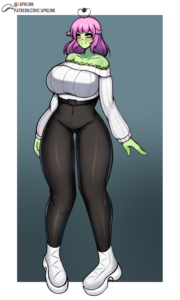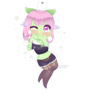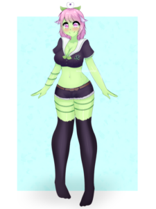 Vinyl, a member of the Lae species, was born with vibrant green skin, her very being tied to nature. Lae are unique plant-like humanoids who draw their energy from the sun and water. They don’t need traditional food to survive, thriving instead by absorbing sunlight through their skin and hydrating with water. As a child, Vinyl’s unusual appearance made her stand out, especially in a human-dominated world. Her time in school was marked by cruel bullying, as classmates teased her for her green skin, photosynthetic nature, and quiet demeanor. As she grew older, the bullying became unbearable, and in her teenage years, Vinyl began skipping school, choosing solitude over torment.